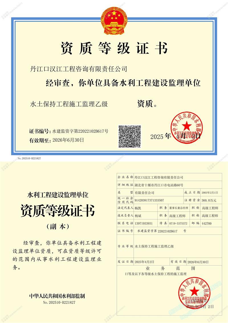 (原漢江綜合開發(fā)公司水利水電監(jiān)理中心)成立于 1989年3月,1993年6月經(jīng)水利部審批成為首批注冊監(jiān)理單位 (隸屬于長江水利委員會), 注冊資本 360萬元 。公司位于湖北省十堰市丹江口市電站路。公司目前擁有水利部頒發(fā)的 水利工程施工監(jiān)理甲級 、 水土保持工程施工監(jiān)理 乙 級 資質(zhì) ;住建部頒發(fā)的 房屋建筑 、 市政公用工程監(jiān)理 乙 級資質(zhì) 。 可獨立承擔 各類水利水電工程 、 一般工業(yè)與民用建筑工程監(jiān)理 , 土地整治 , 招標代理 、 技術(shù)咨詢 等業(yè)務。公司實行董事會領(lǐng)導下的總經(jīng)理負責制,下設(shè)辦公室、經(jīng)營部、財務部、工程技術(shù)部等職能部門。……